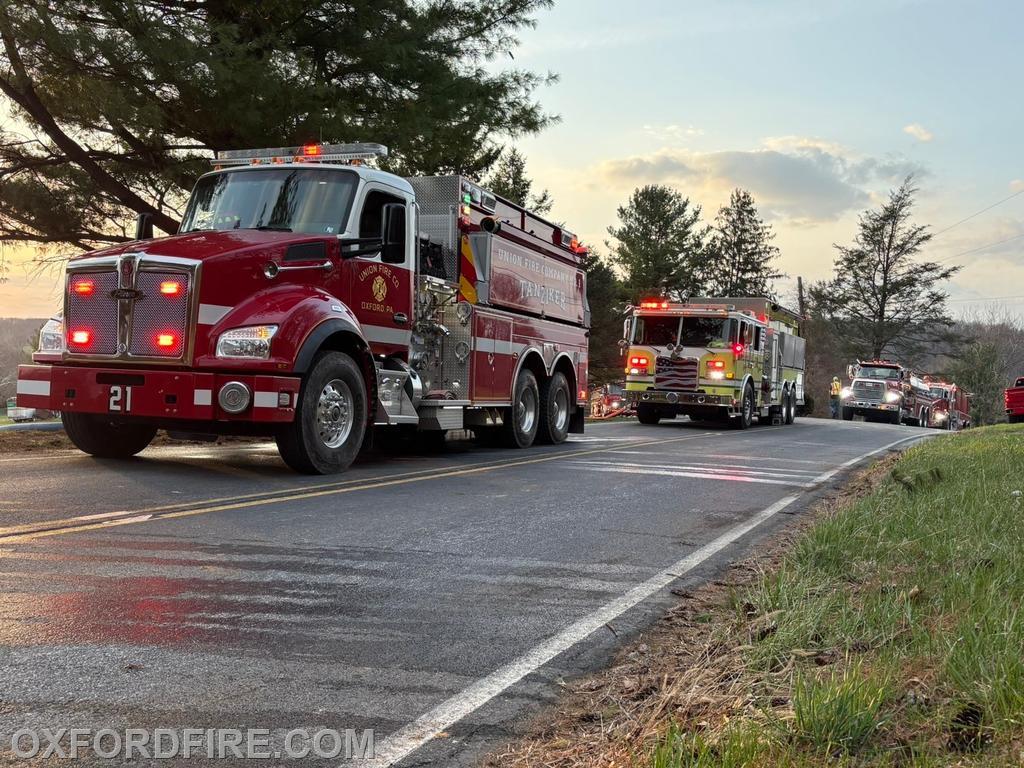 Engine 21-1, Tanker 21, and Squad 21 responded. First arriving units from Quarryville found a barn well involved in fire. Union crews assisted with overhaul and extinguishing hotspots. Tanker 21 assisted with shuttling water from a nearby pond, to the fire scene.